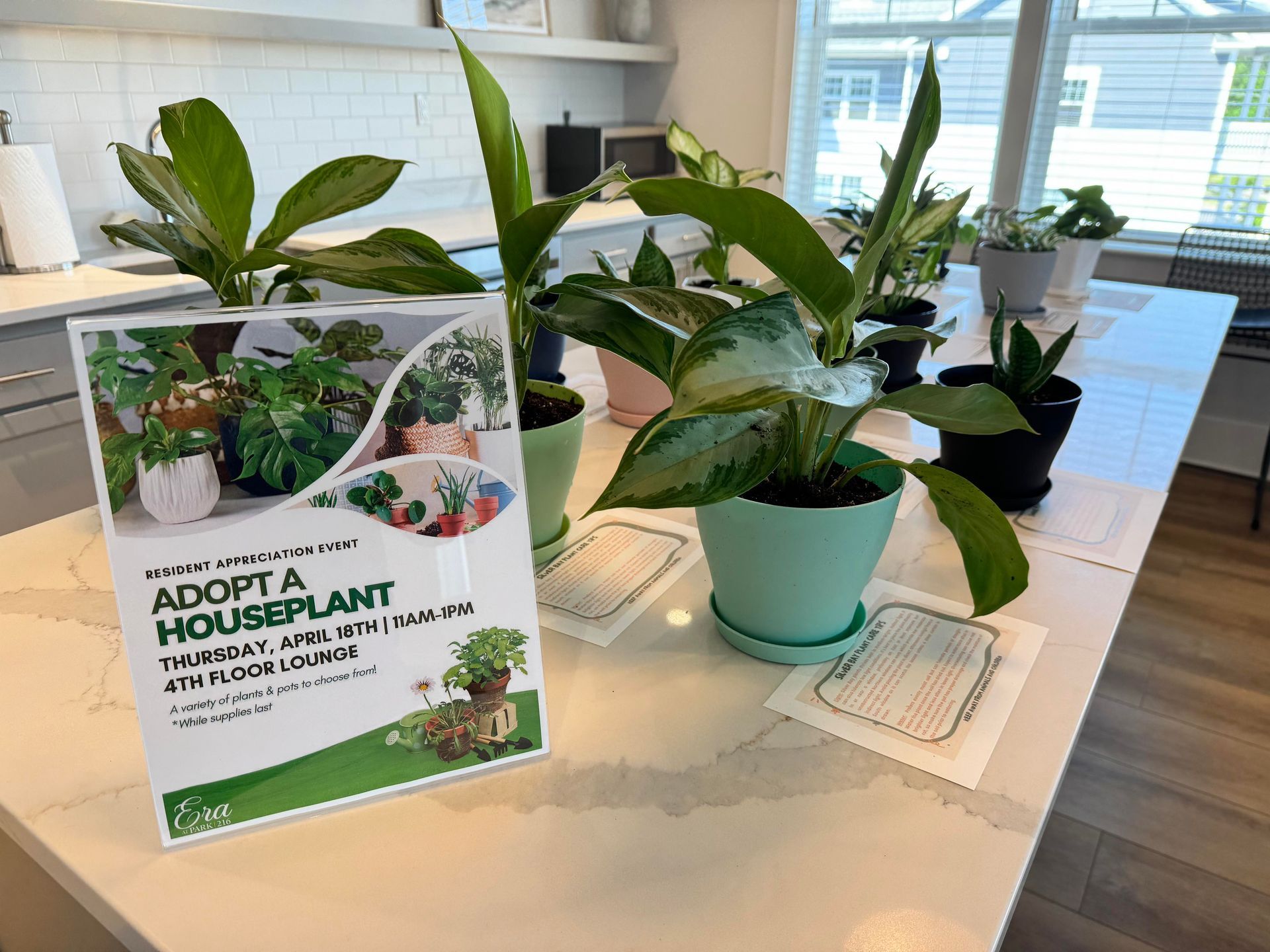 Our FIRST resident event is coming up! Join us next Thursday, April 18th, from 11am-1pm, inside the 4th Floor Lounge, for our Adopt a Houseplant event. This event will feature a variety of plants and pots to choose from to take home! See you there! 🌱